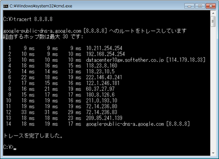 VPN に接続している間は、インターネットへのすべての通信は VPN サーバーを経由して行われます。VPN サーバーを経由した通信が行われていることを確認するには、Windows のコマンドプロンプトから「tracert 8.8.8.8」コマンドを実行してみてください。